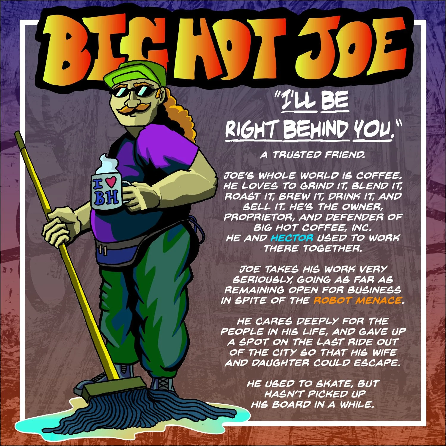 Illustration of a cartoon character named Big Hot Joe holding a mug, wearing a green cap, sunglasses, and a purple shirt, standing with a mop. Text describes his love for coffee as a business owner of Big Hot Coffee, Inc., and mentions his seriousnes View fullsize