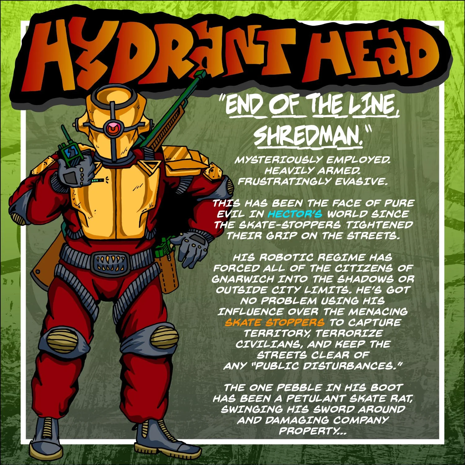 Illustration of a character named Hydrant Head, depicted as a robotic figure in red and yellow armor holding a weapon. Background text describes him as a villain in Hector's world, part of a regime that controls a fictional city, using 'skate stopper