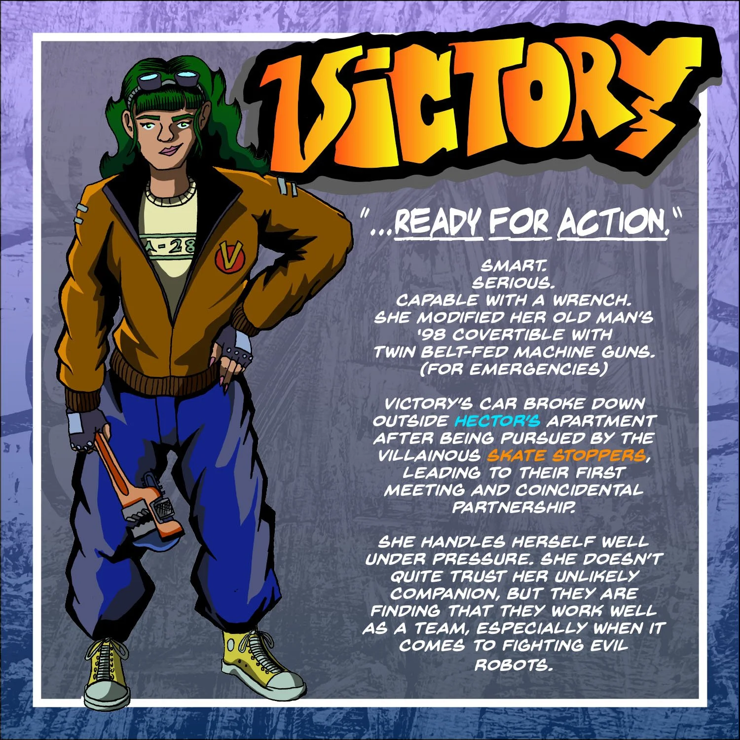 Comic book character Victory description page with image and text detailing her traits and storyline, wearing casual clothes and holding a wrench.